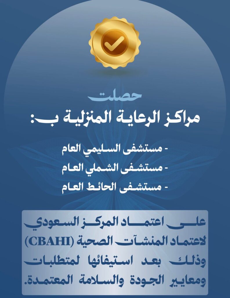 حصلت مراكز الرعاية المنزلية في مستشفيات السليمي العام، والشملي العام، والحائط العام، إحدى مكونات تجمع حائل الصحي، على اعتماد المركز السعودي لاعتماد المنشآت الصحية (CBAHI) .