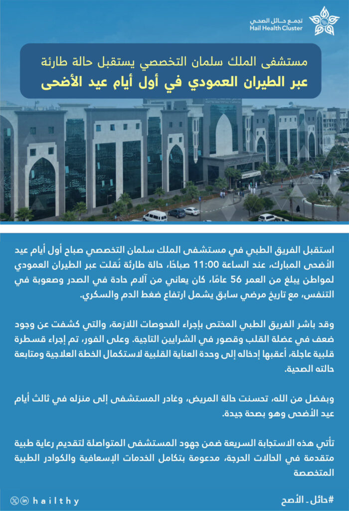 استقبال حالة طارئة عبر الطيران العمودي في أول أيام عيد الأضحى