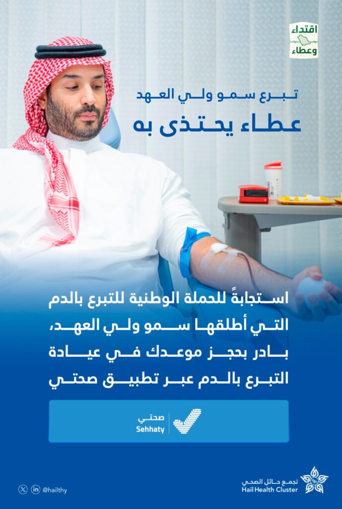 استجابة للحملة الوطنية ” اقتداء وعطاء ” التي أطلقها سمو ولي العهد ،، عيادات التبرع بالدم في حائل تتفاعل مع الحملة