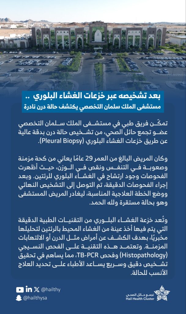 مستشفى الملك سلمان التخصصي يكتشف حالة درن نادرة بعد تشخيصه عبر خزعات الغشاء البلوري